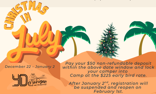 Pay your $50 non-refundable during our special Christmas in July promotion from December 22 -- January 2nd. Give the gift of youth camp this Christmas. Your $50 deposit locks your child/children in to camp at the early bird rate of $225. After January 2nd, camp registration will be suspended until February 1st, when registration opens for campers and staff.